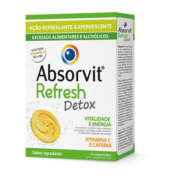Absorvit Refresh Detox 12 Comprimidos Efervescentes, suplemento alimentar. Com a finalidade de ajudar a reduzir a sensação desagradável causada pelo tabaco ou pela ingestão excessiva do álcool.