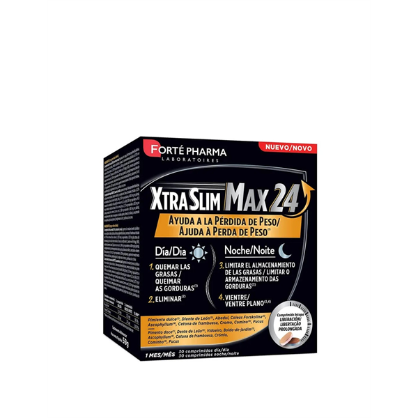 XtraSlim Max 24 é um suplemento alimentar de nova geração para ajudar na perda de peso. A fórmula combina a nossa experiência na área da cronobiologia adelgaçante e uma inovação galénica: comprimidos bicamada com uma dupla libertação de ingredientes.